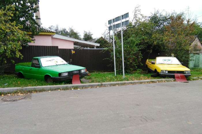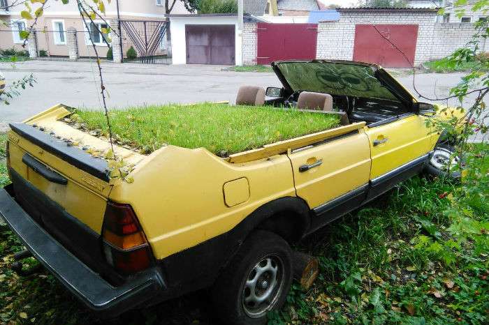 Срезав часть крыши, в кузовах автомобилей они посадили траву, сделав их предметами декора на городской улице.