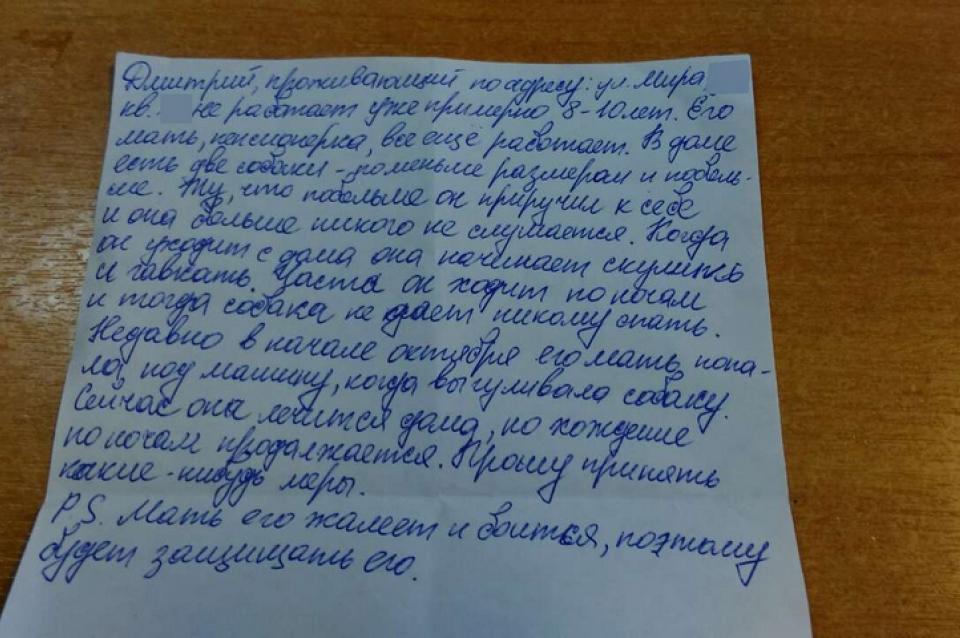 «Дмитрий, проживающий по адресу: ул. Мира…, не работает уже примерно 8–10 лет. Его мать, пенсионерка, все еще работает. В доме есть две собаки – поменьше размером и побольше. Ту, что побольше, он приручил к себе, и она больше никого не слушается. Когда он уходит из дома, она начинает скулить и гавкать. Часто он уходит по ночам, и тогда собака не дает никому спать. Недавно в начале октября его мать попала под машину, когда выгуливала собаку. Сейчас она лечится дома, но хождение по ночам продолжается. Прошу принять какие-нибудь меры. P.S. Мать его жалеет и боится, поэтому будет защищать его».